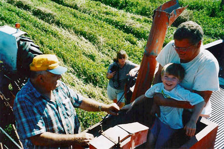 We grow approximately eight acres of Hard Red Winter Wheat. The wheat seed is planted in mid-September, sprouts, and grows three or four inches before winter snows cover it up. In the spring it grows rapidly forming the grain heads in June. By late July the sea of green has turned a golden yellow and the harvest draws near.