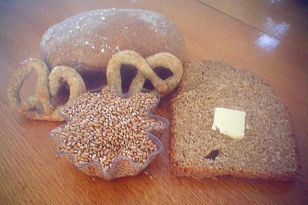 At the East Jordan Farmer's Market we will be offering our customers a chance to hand grind our wheat into whole wheat baking flour this year. When ground into flour it will still contain 100% of the wheat germ, bran and gluten. Most commercial "whole wheat flour is a white flour to which a portion of the bran which was removed is re-added. The wheat germ is totally removed. Factory bread makers use this "whole wheat" which is usually 40% white flour. Commercial flour is also chlorine rinsed, potassium bromide aged and either benzoic peroxide, chorine dioxide or ammonium chloride bleached.
